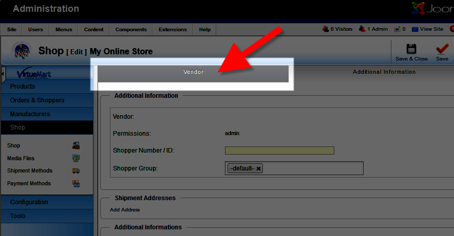 - On the VirtueMart menu, click the Shop option, then Shop again underneath.