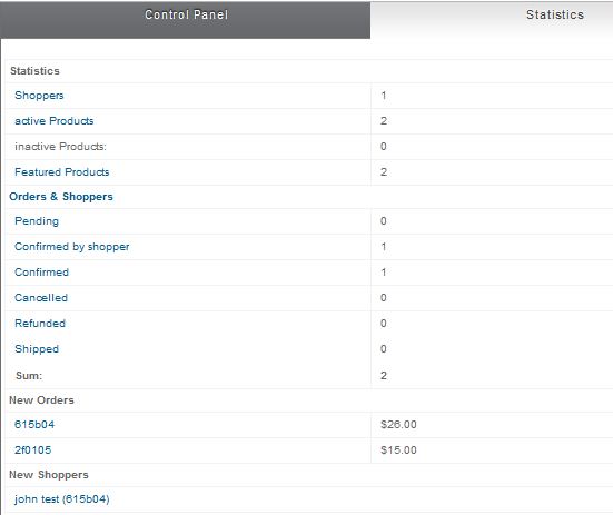 Shoppers - This option will list how many shoppers made purchases, click it to see a list of all your registered Shoppers. active Products - This will list how many products you currently have for sale. Click it to view the list of products. inactive Products - This is will list all products you have that are not available. Click this to view a list of inactive products. Featured Products - This is a list of featured products, click it to view the featured products. |