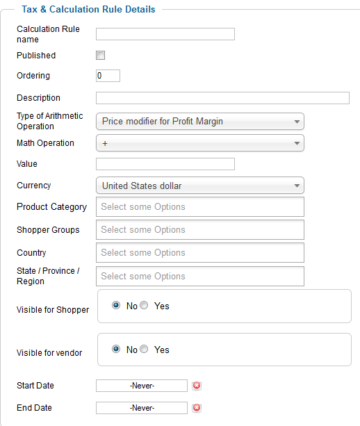 | Published | Check this box to make this tax option function, if you do not it will still be visible in the admin panel. |