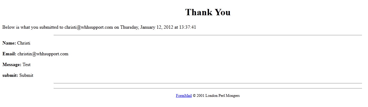 Please note in the example above, you will need to create the thankyou.html file. You can also name this file differently (thanks.html for example). Just make sure that name of the file you create matches the name of the file referenced in the tag (e.g. value="http://www.yourdomain.com/thanks.html" / >. This tag is completely optional, if you do not include this tag, users will instead be redirected to the default FormMail Thank You page: