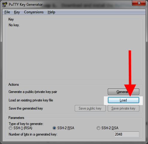 On your local computer, open PuttyGen and click on the Load button.