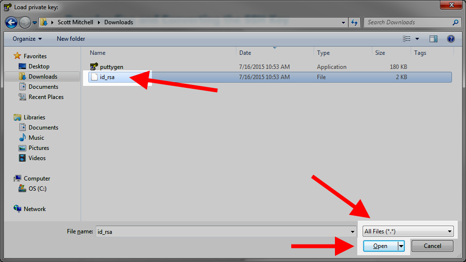 Now, click on the PuTTY Private Key Files (*.ppk) dropdown menu and change it to All Files(*.*) and then select the id_dsa file you previously downloaded to your computer. Next, click the Open button.