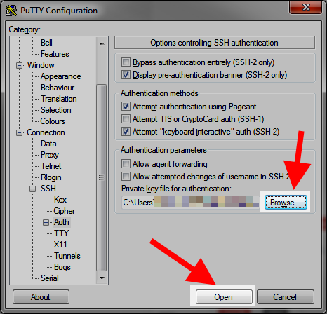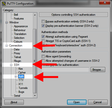 Open PuTTY and click SSH and Auth located under the Connection option.