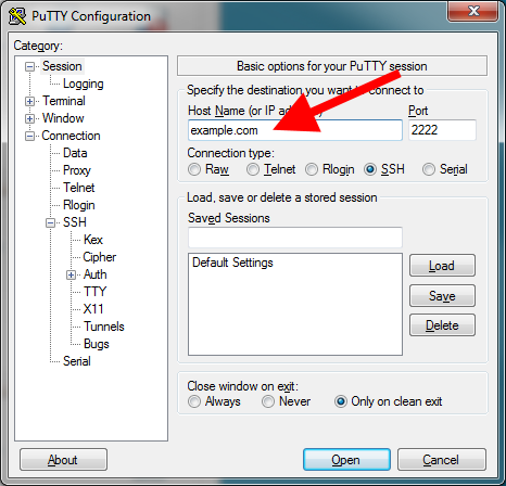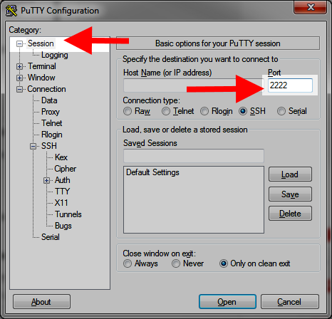 Next, click Session and enter 2222 for the port.
