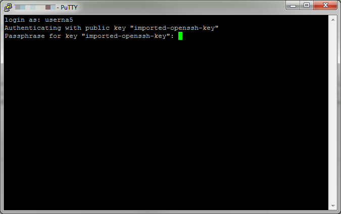 Next, enter the password for your key file and press Enter. PuTTY will not display any information on the screen when you are entering the password.