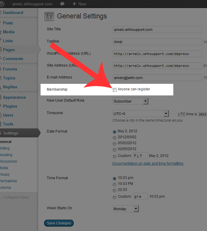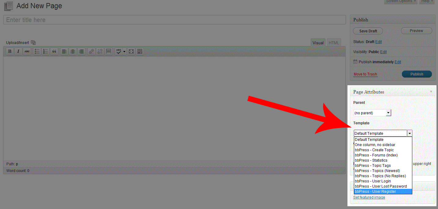 *The information for setting up the user registration page for bbPress is based on the use of the default theme for Wordpress. Most themes will work with the newest version of bbPress, however, there will always be exceptions. To find more information on the bbPress code used for themes, please visit this link: