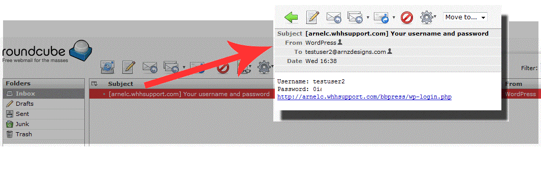 Note that clicking on the link provided in the email will bring the user to the login screen for Wordpress. The page that is link is the Wordpress login page. Remember that bbPress integrates the Wordpress registration feature, but sets up the user as a Forum Participant. If you are trying to setup an adminstrator or moderator for your forums, you will need to login to the Wordpress Dashboard as an administrator in order to add that type of user.