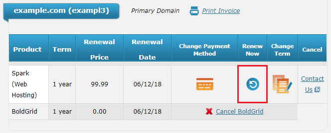 On this page, you will see a listing of hosting subscriptions and domain registrations you have purchased from Web Hosting Hub. Find the product that you would like to renew, and under the Renew Now column click the blue icon.