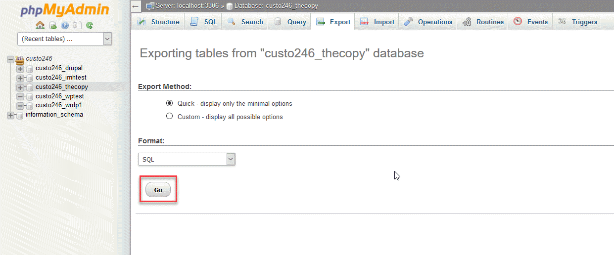 The export option that we are providing instructions for is the Quick method. Click on the radial button for Quick. If you want more complete control, then click on Custom. You will need to be familiar with the exporting MySQL databases in order to use these options. If you are not, then please consult with an experienced database administrator or developer.