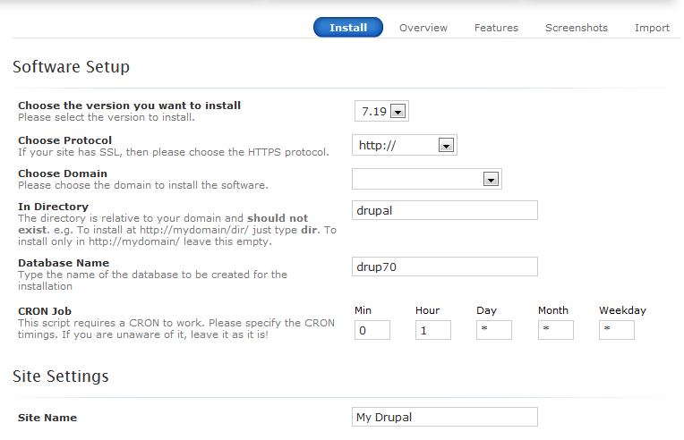 Drupal is one of the more popular CMS applications that can be installed using the installation program known as Softaculous. The install of Drupal becomes a very quick and clean procedure when using Softaculous. Additionally, Softaculous will help keep the program up-to-date and send the installation details to the user via email. The following instructions highlight the steps used to install Drupal through the Softaculous installation.