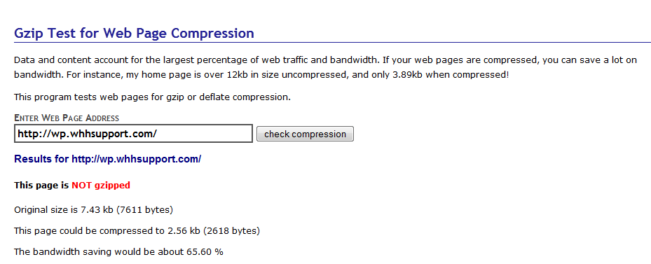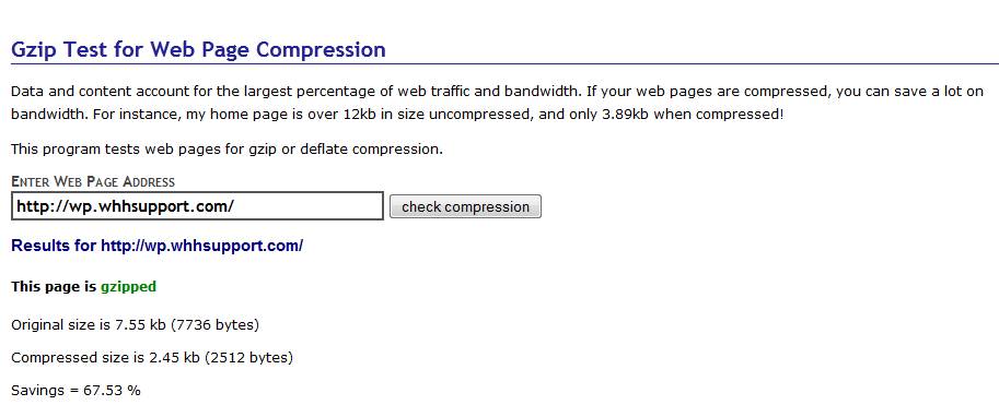 Once you've enabled gzip compression in cPanel, you may want to check your site to make sure it's working. You may also be curious about how well the compression is working. The easiest way to test this is by using one of the many online tools for testing gzip compression. Here's an example of our before and after results from one of the tools we found: