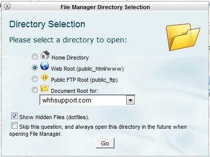 - A popup box will appear asking in which directory you want to begin. For the primary domain, simply click the radio button labeled Web Root. If you are working with an addon domain, you can select the appropriate document root from the Document Root for: dropdown. Once you select your desired directory, click on the Go button to enter.