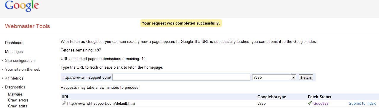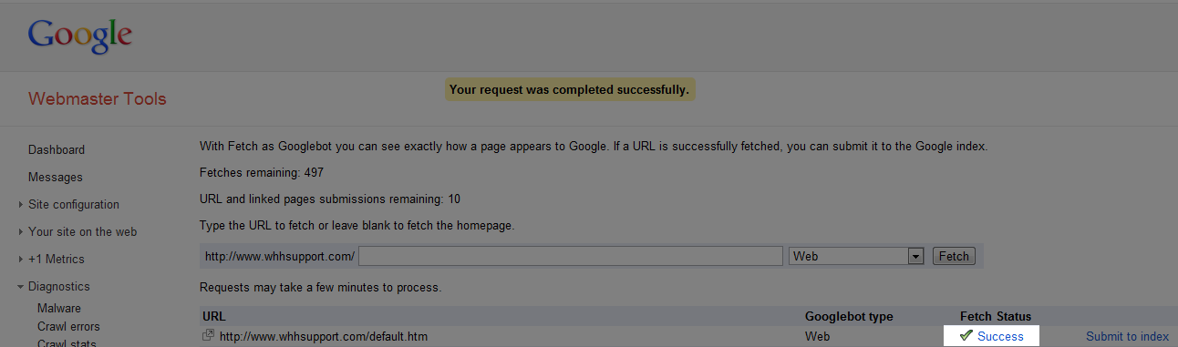 If the request is successful, you will see "Success" under the "Fetch Status" column.