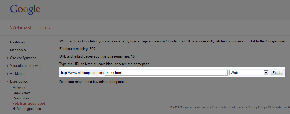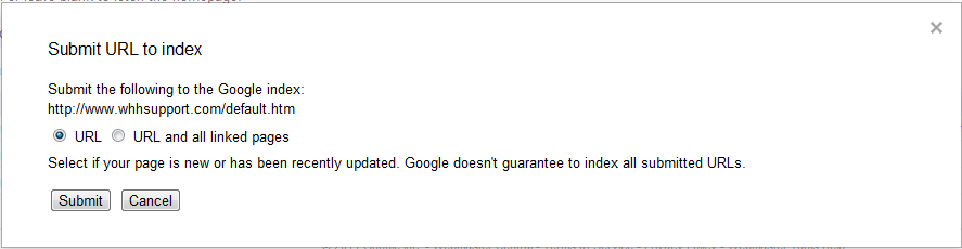 Please note, Google does have a limit of 50 submissions per week for just the URL. If you are submitting the URL along with all pages linked from that URL, the limit on submissions is 10 per month. You can view how many submissions you still have available on the Fetch as Googlebot page.