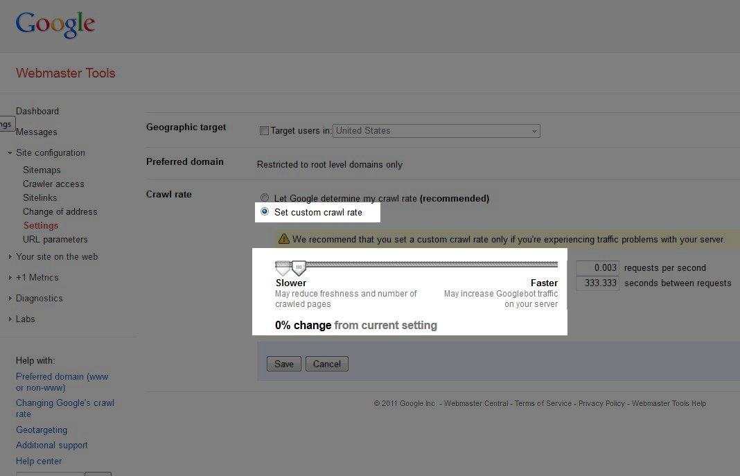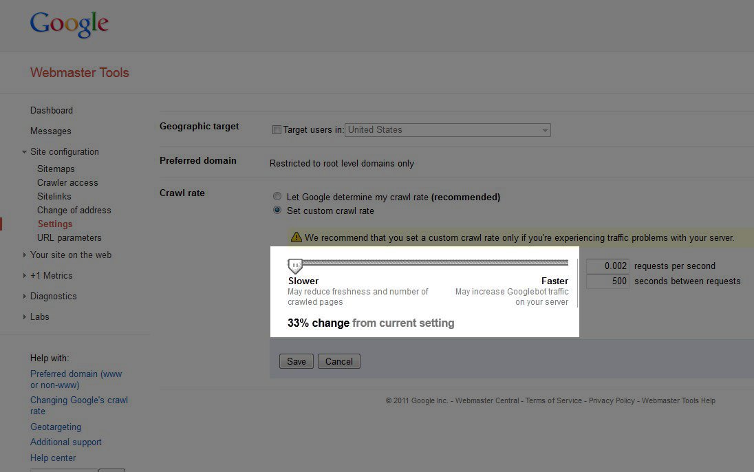 - Click the Save button to save your new crawl rate. As you can see in the image below, we reduced our crawl rate by 33% in this example.