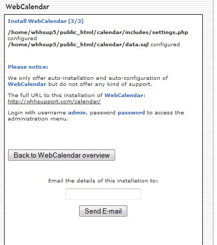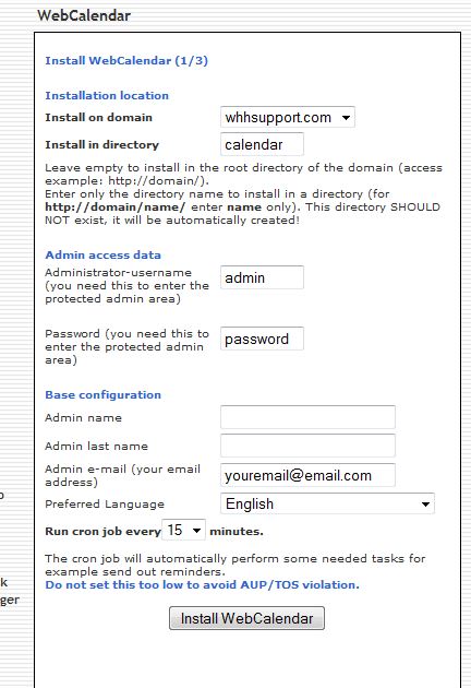 There, fill out the information. It is recommended that you put the WebCalendar in a separate directory, as shown in our screenshot.