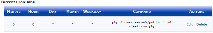 - At the bottom of the screen you will see the cron jobs you have set up. Click on the Edit link on the right to edit the command.