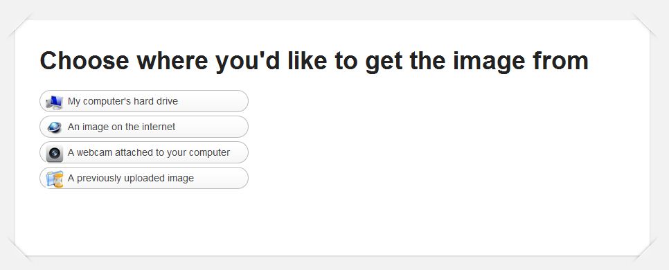 On the next page you'll have the option to upload a file from your computer, use an image you already have on the Internet, or take a new picture with a webcam connected to your computer. For this example we'll upload a file from our computer by clicking on the "My computer's hard drive."