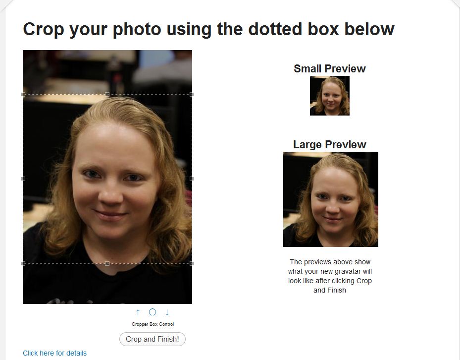 Next, we will crop our uploaded image. You can grab any side to enlarge or shrink the area to be cropped. Since Gravatars are square images, your image will need to be cropped to a square as well. When you're satisfied with what the image will look like after cropping, click the "Crop and Finish!" button to proceed.