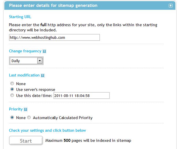 There are various websites online that offer a free Sitemap generator. For this example we will use http://www.xml-sitemaps.com for generating an XML Sitemap. After navigating to the website, fill in your website information and click Start: