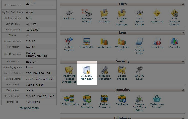 First, log into your cPanel. Navigate to the IP Deny Manager: