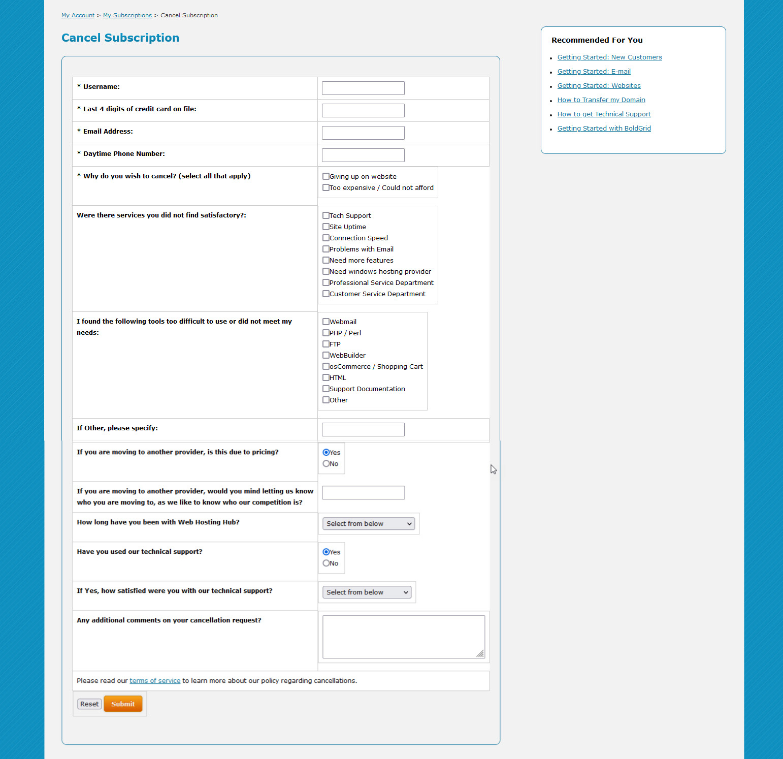 After you have selected the subscription to cancel, you will see a form that needs to be filled out before you cancellation request is submitted. When you have completed the form, click on the Submit button at the bottom to process your cancellation request. You can also click on the Reset button to void your cancellation request.