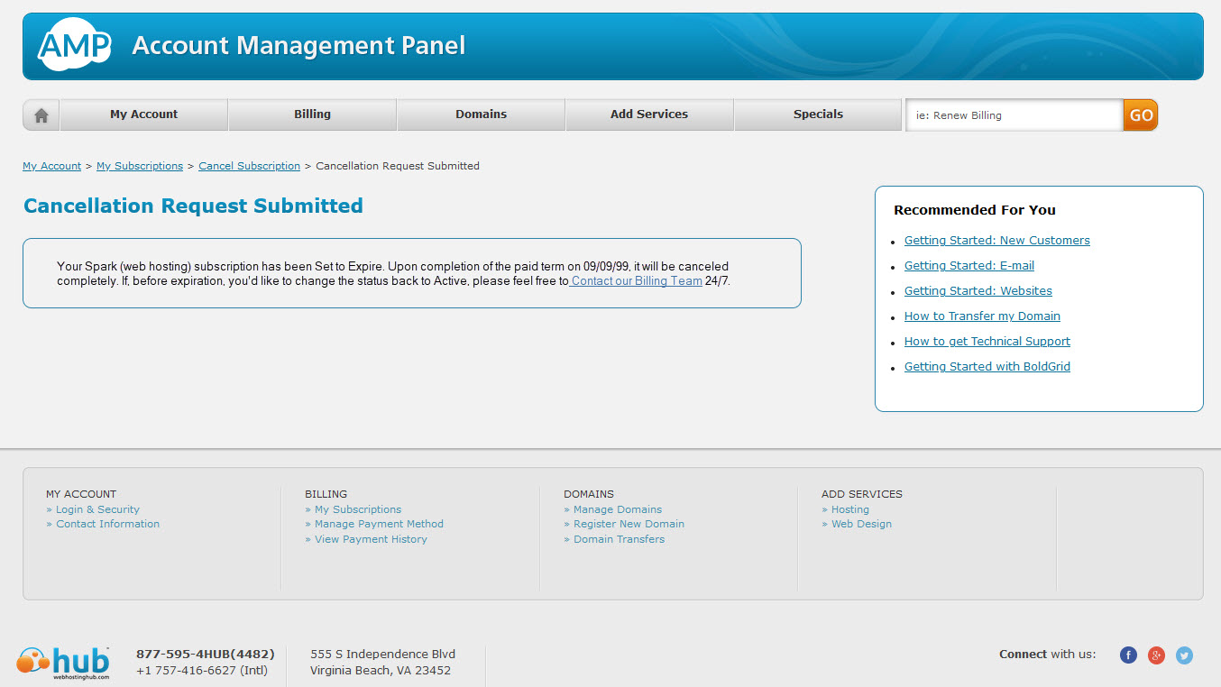 After you have submitted your cancellation request, you will see a confirmation screen verifying your selection. There will be details on when the cancellation takes effect. There will also be a link to the Billing team if you wish to change the status back to Active.