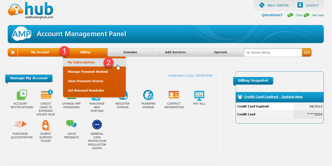 In the menu at the top of the screen, click on Billing, the click on My Subscriptions.