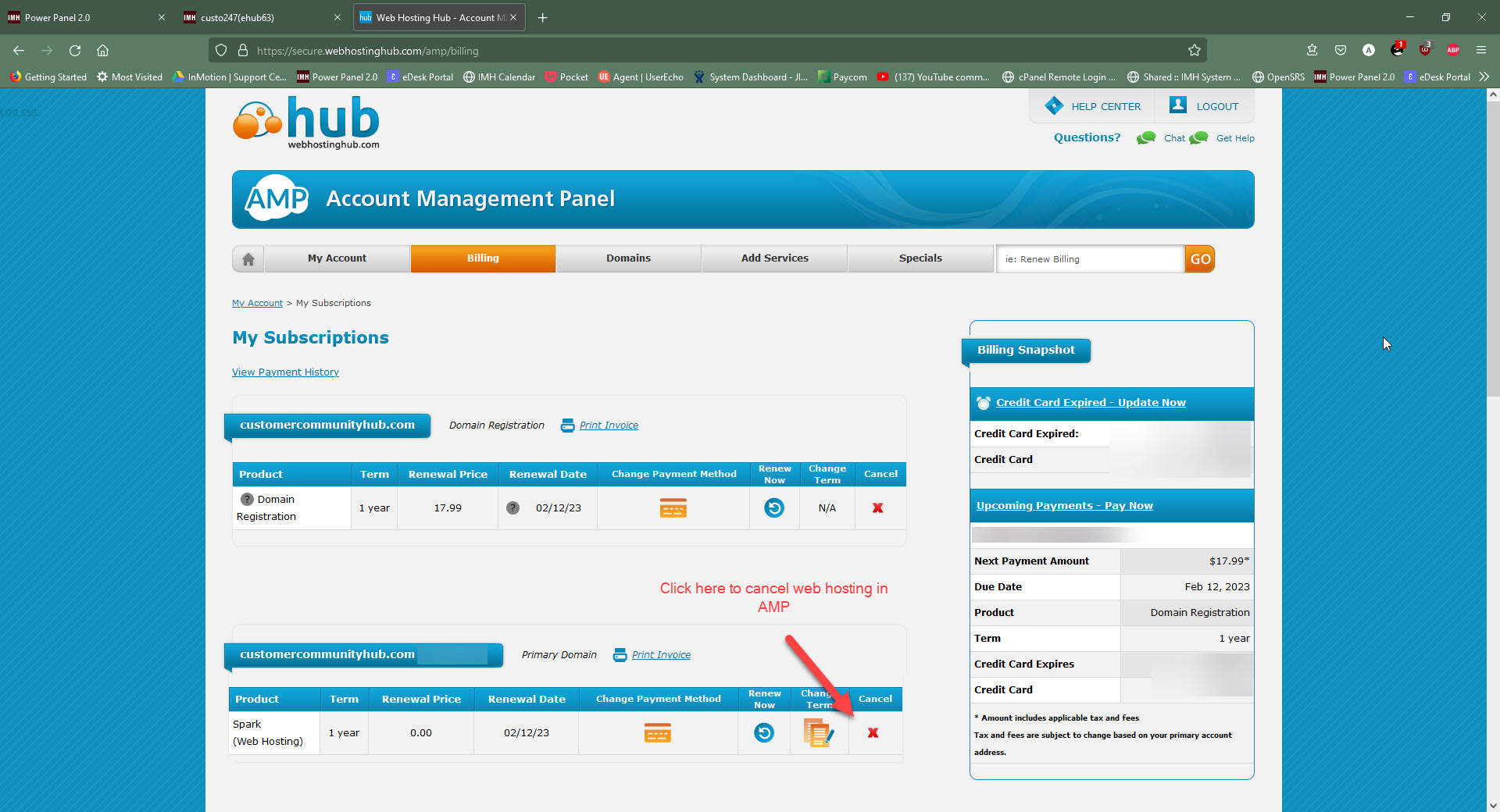You can do payments in the Account Management Panel (AMP). Here's the login page. Contact support or billing via phone/email/chat if you're unable to take care of the issue. If you have any further questions, please let us know. Kindest regards, Arnel C. |