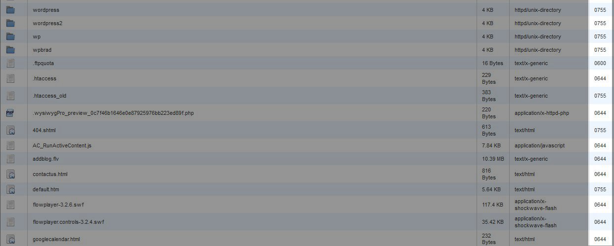 If your permissions aren't set up correctly, it can allow unauthorized users access to hack your website. Also, once your site's hacked they can change your permissions to make your site even more vulnerable. If you see any files with permissions set at 777, this means that "world" has full access. Rarely will you have a file that needs to be written to and executed by the "world." If any of your file permissions do not match the default permissions, they may need changing. Also, one of the most common needs to update permissions is to make scripts in the cgi-bin 755.