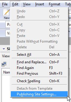 Once you have your site file(s) ready to publish in KompoZer, you will want to set up the publishing settings for your site. Begin by either clicking on the Edit Sites icon in the Site Manager pane or selecting Edit in the top menu bar.