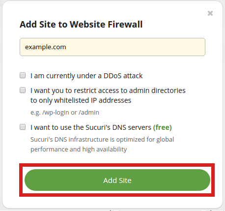 On the "Add Site to Website Firewall" page enter your domain name in the field. Choose from the provided options, then click the Add Site button.
