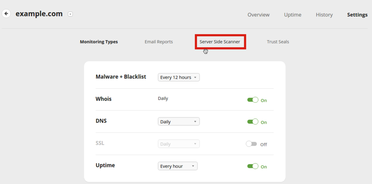 "This scan is an extension to our remote malware/blacklist scan and it runs once a day. It verifies every single file on your site, looking for backdoors, phishing and any other security issue that our remote scanner could miss. It also tracks file changes, giving you an audit trail of any change that happens on your files.You can enable Server Side Scanning for no extra cost. It is not required, but we recommend all our users to enable it whenever possible (learn more)."