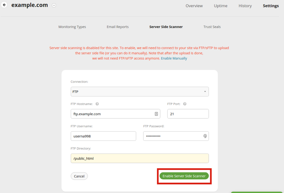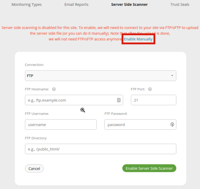 You will see a message stating "Server side scanning is disabled for this site. To enable, we will need to connect to your site via FTP/sFTP to upload the server side file (or you can do it manually). Note that after the upload is done, we will not need FTP/sFTP access anymore. Enable Manually." Click the Enable Manually link.