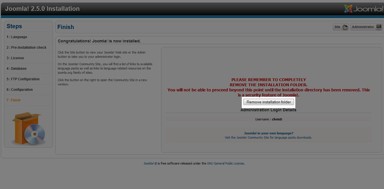 - You will then see a notification that the folder has been successfully removed. Click on the Administrator button in the upper right of the page to go to your Joomla Administrator log in page. Notice that this URL is wherever you installed Joomla followed by /administrator. In our example, since we installed Joomla to joomla.example.com, our administrator log in page is at http://joomla.example.com/administrator.