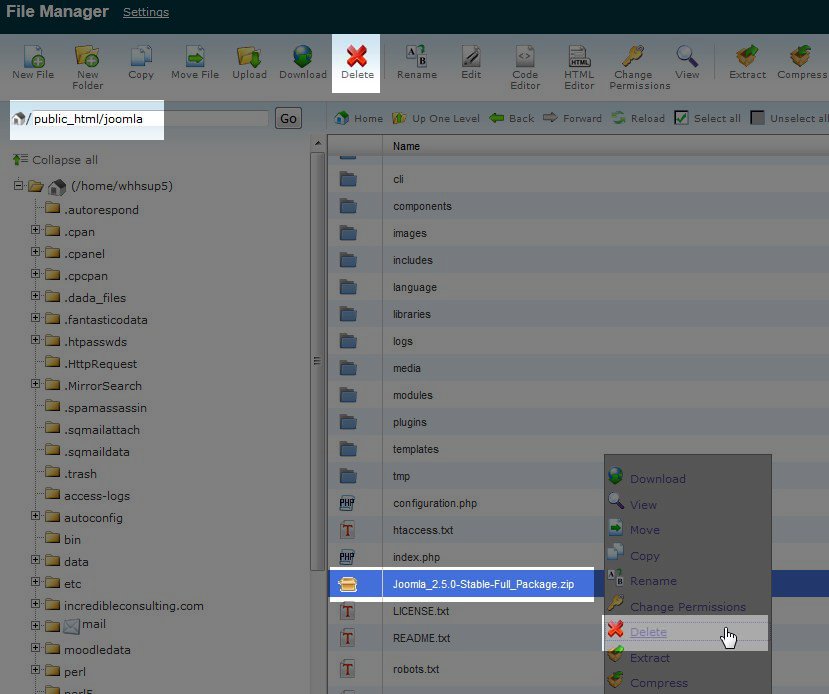 - Before logging into the Joomla administration area, there is one more "house cleaning" task we need to take care of. Using either the cPanel File Manager or an FTP program, navigate to the directory where you installed Joomla and delete the Joomla package we originall uploaded at the beginning of this walk through. Select the file and either right click and choose Delete or click the Delete icon at the top of the page.