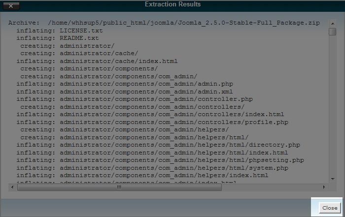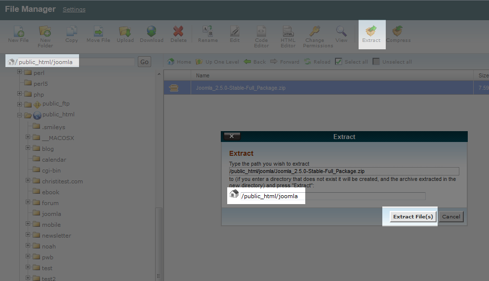 - Using the cPanel File Manager, select the Joomla package, right click and select Extract (or choose Extract from the menu at the top of the page). Keep the extracted files in the same folder and click the Extract button to finish unpacking the files.