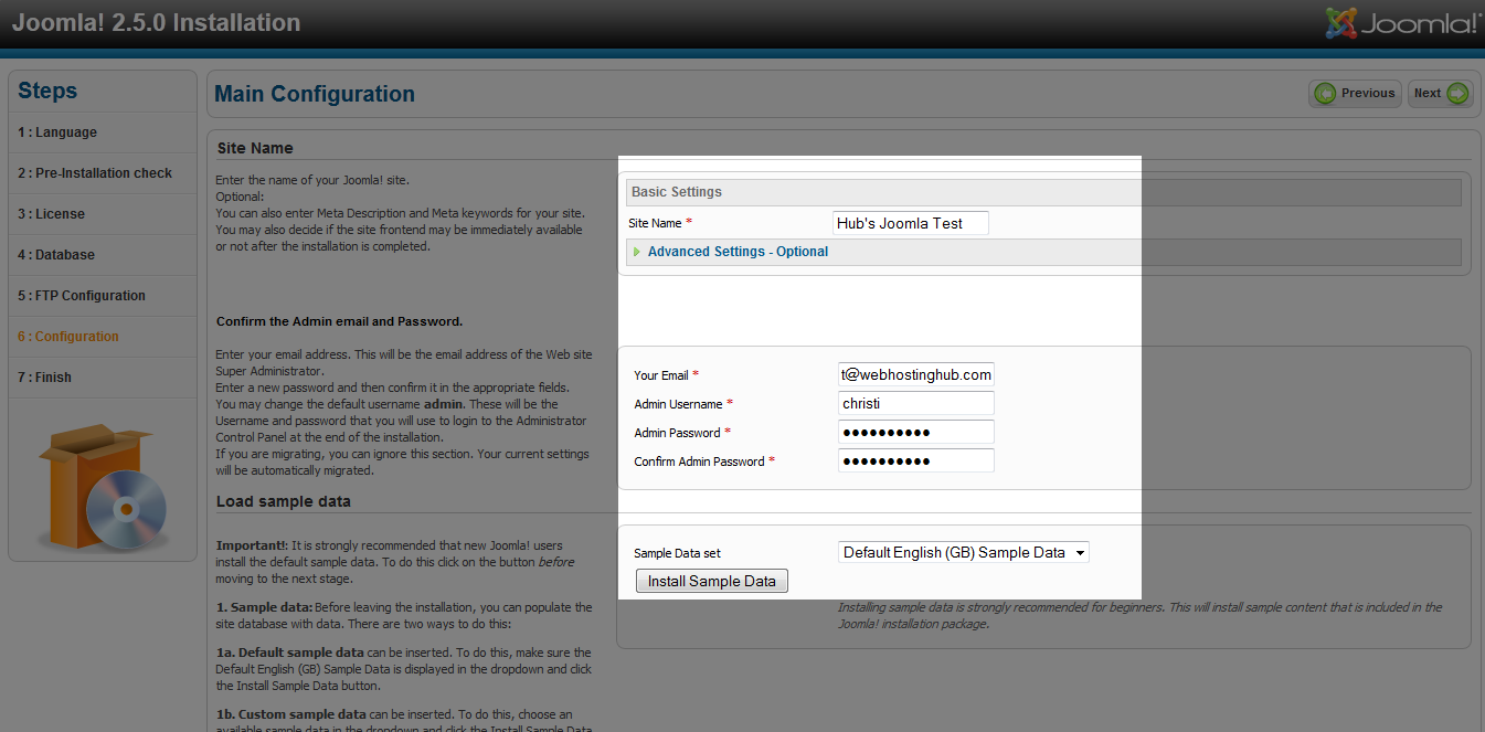 If you want to install the sample data to your site, click the Install Sample Data button.