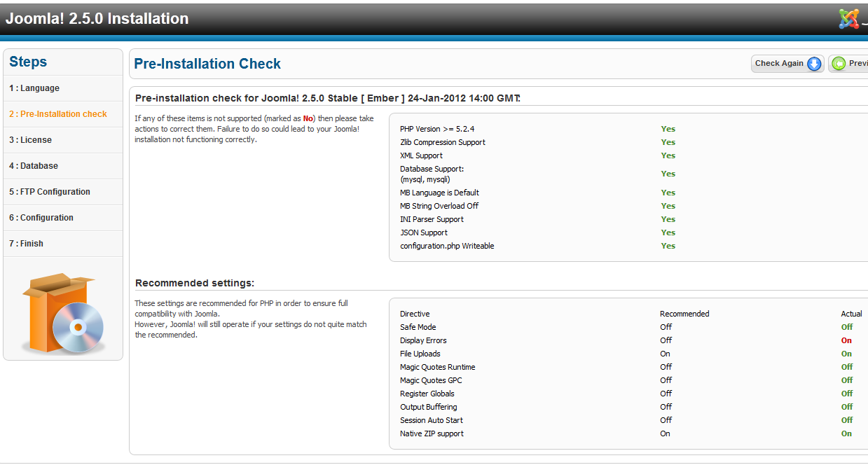 You should see a page similar to the following which shows that the server settings are compatible with Joomla 2.5. Please note, by default, Display Errors is turned on to assist customers with debugging (if needed) during website set up. If you would like to turn Display errors off, please see our article on updating your local PHP settings for instructions. The line you will want to change to off is display_errors. For now, click Next to continue.