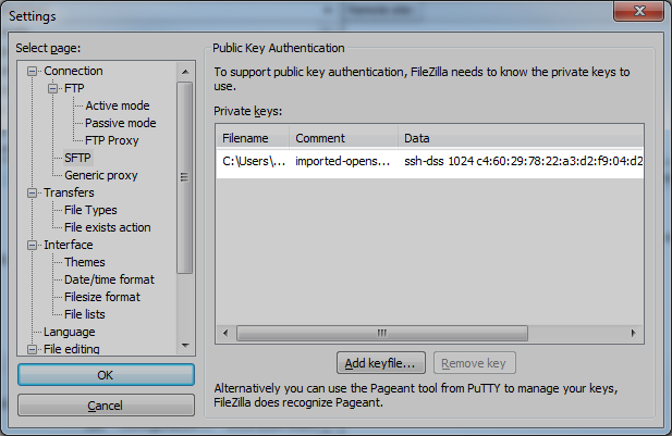 After your keys have been generated, you will need to create your SFTP profile in your FileZilla application which requires to steps: Attaching your private keyfile to FileZilla and then creating your connection profile.