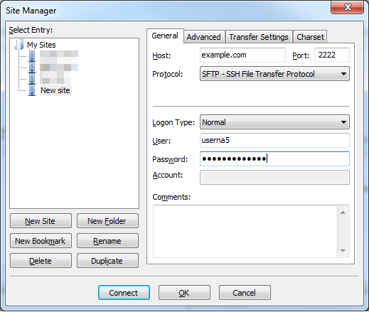 | Protocol | Set this to "SFTP - SSH File Transfer Protocol". |