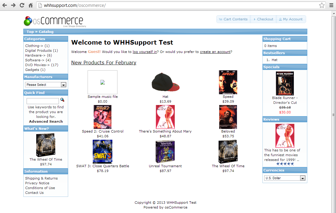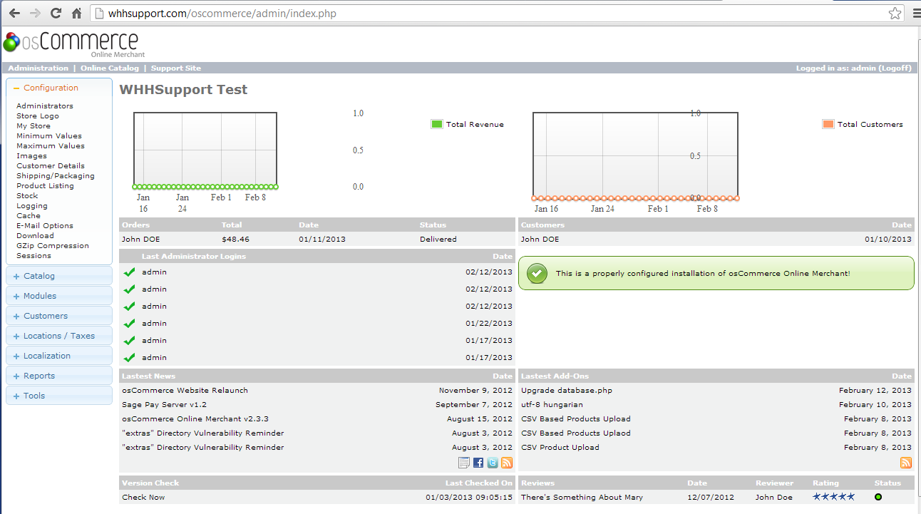 - Click on the Login button to submit your admin credentials. Once they pass, you will be directed to the default admin page. From here you can begin to administer your osCommerce store!