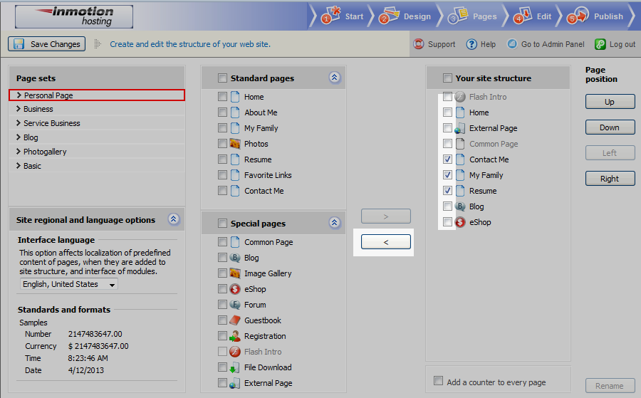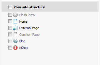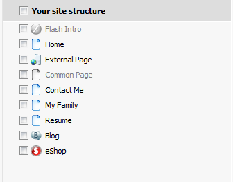 This brings you to the Pages screen. The far right columns is named Your site structure and lists all pages on your site. To remove particular pages, simply check the checkbox next to each page you want to remove. In our sample, we are removing three pages (Contact Me, Resume, and My Family)