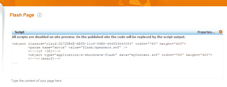Important! The script cannot be seen in the preview. You have to publish the site to see the Flash work on your live website.