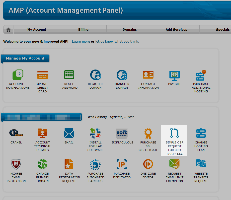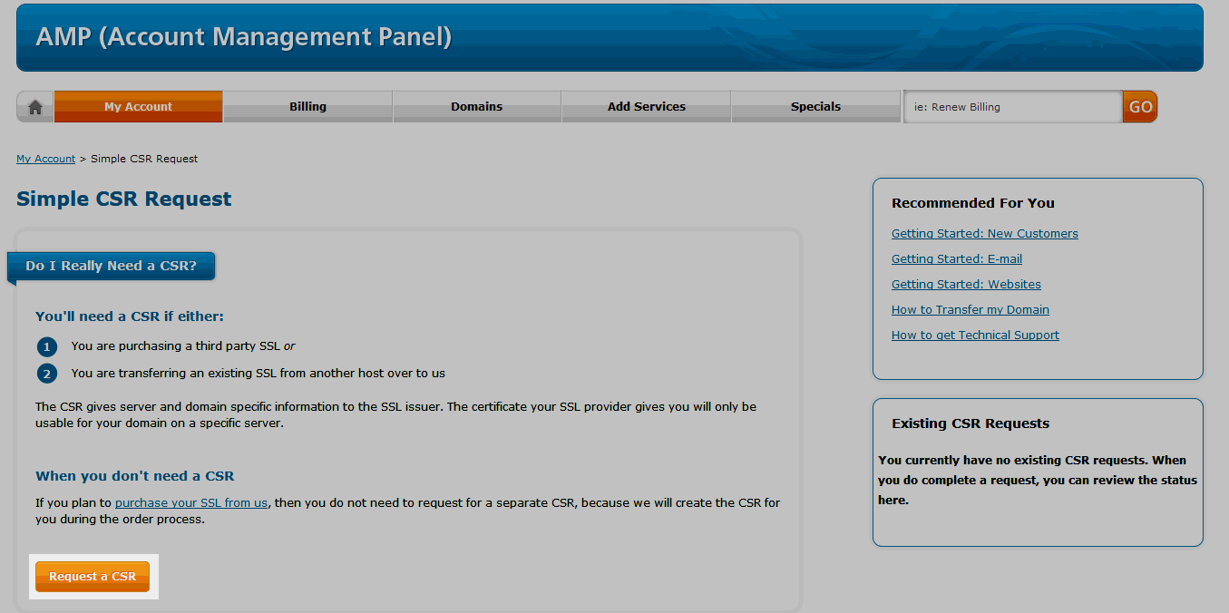 You can request your CSR through your Account Management Panel(AMP) following the steps below:
