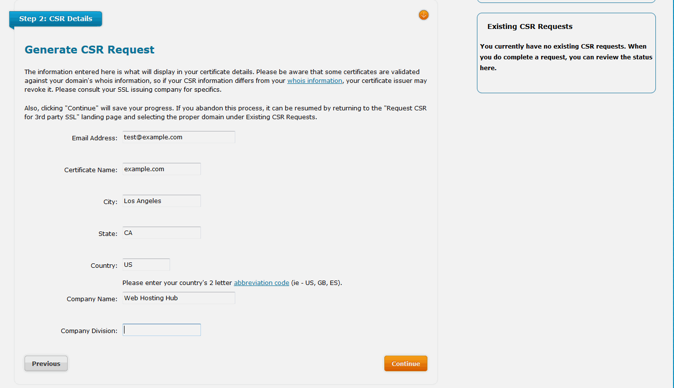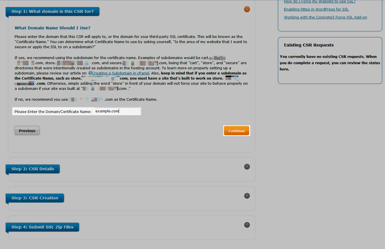 This page begins the steps to create and receive your CSR. You must enter the specific name you will use for your SSL. Typically this is just the domain name (ex: example.com) You can also be more specific and use a subdomain name for your store such as store.example.com, cart.example.com, secure.example.com. Click on the Continue button to go to the next step.