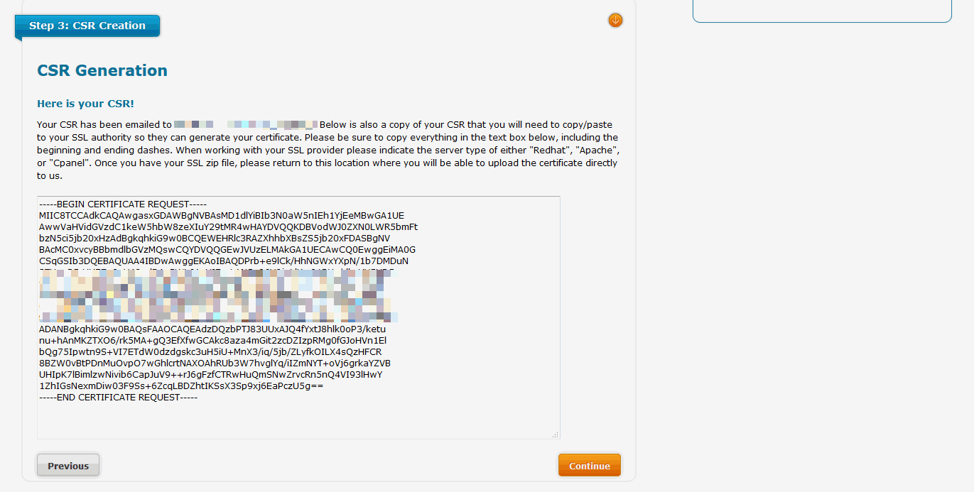 The CSR is now created and presented to you. It uses the information you entered in the previous step. Copy and paste the CSR in its entirety into an email to send to your SSL Provider. Once you have received the SSL files from the provider, click Continue to move to the final step.