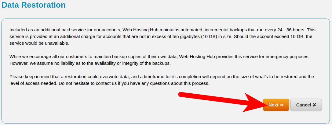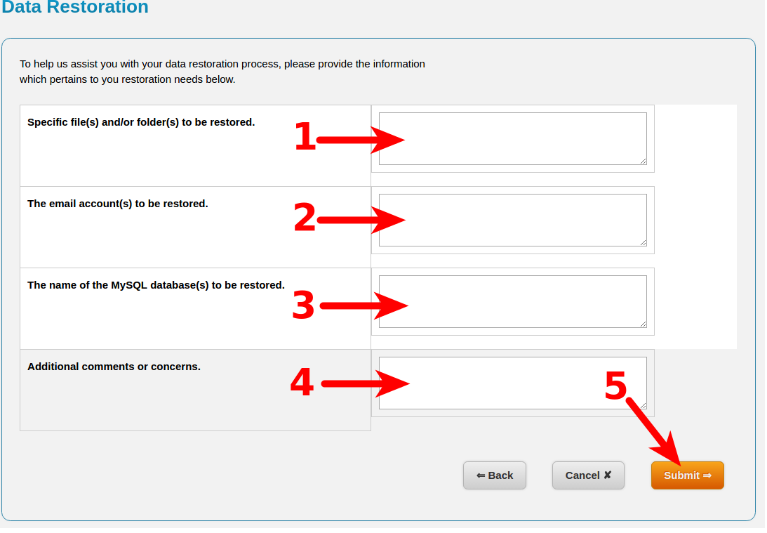 Your Data Restoration request will then be sent to our Live Support team. You will receive an email immediately upon completion of your restoration.