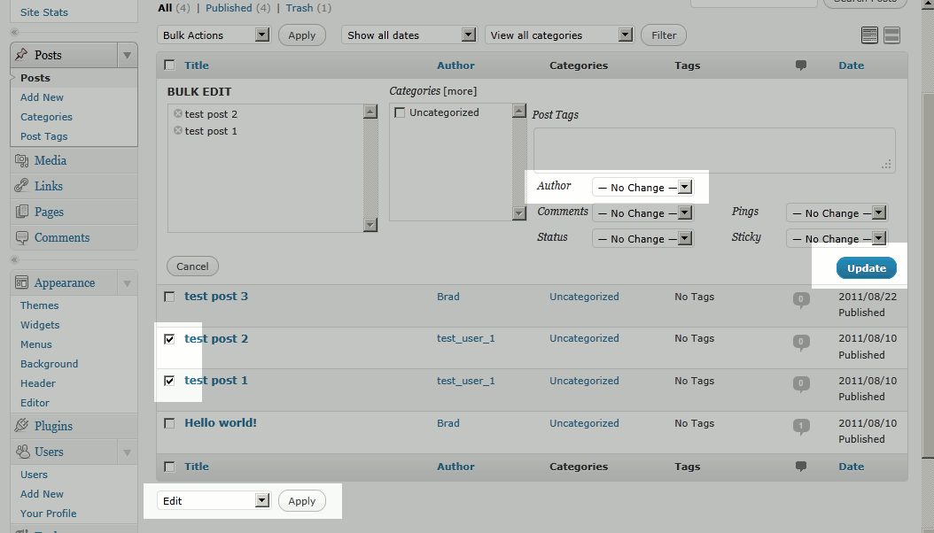 - In the "Bulk Actions" drop down menu, select "Edit", and then click "Apply"