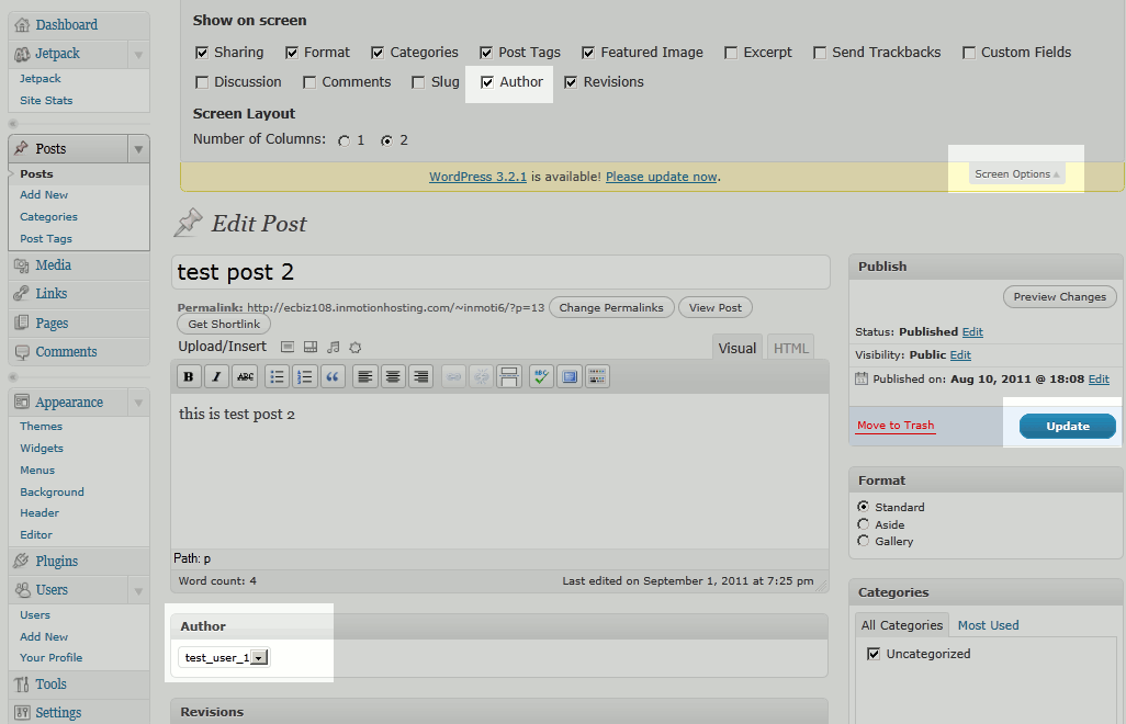 - Find the "Author" drop down list, select the new author, and then click "Update"